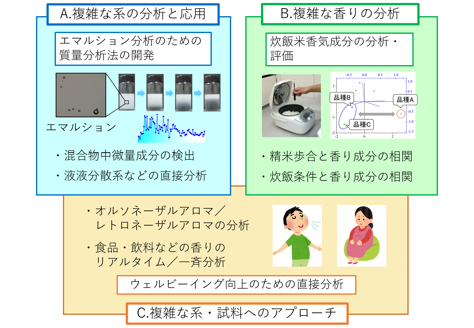 研究課題名にあてはまる項目 | 測定・評価方法(医療・バイオ含む) | 研究概要 | 分析化学をはじめとする工学的手法を用いて、エマルションや食品などの複雑な系・試料中の成分の「見える化」を実現する。エマルションは、水と油のように互いに混ざり合わない一方の液体が他方に微小な液滴として分散した系であり、化粧品やインク、塗料、食品、医薬品など多岐にわたる製品に用いられている。複雑な系であるエマルション試料を精度よく測ることで、品質の良いエマルションの開発に貢献する。 |