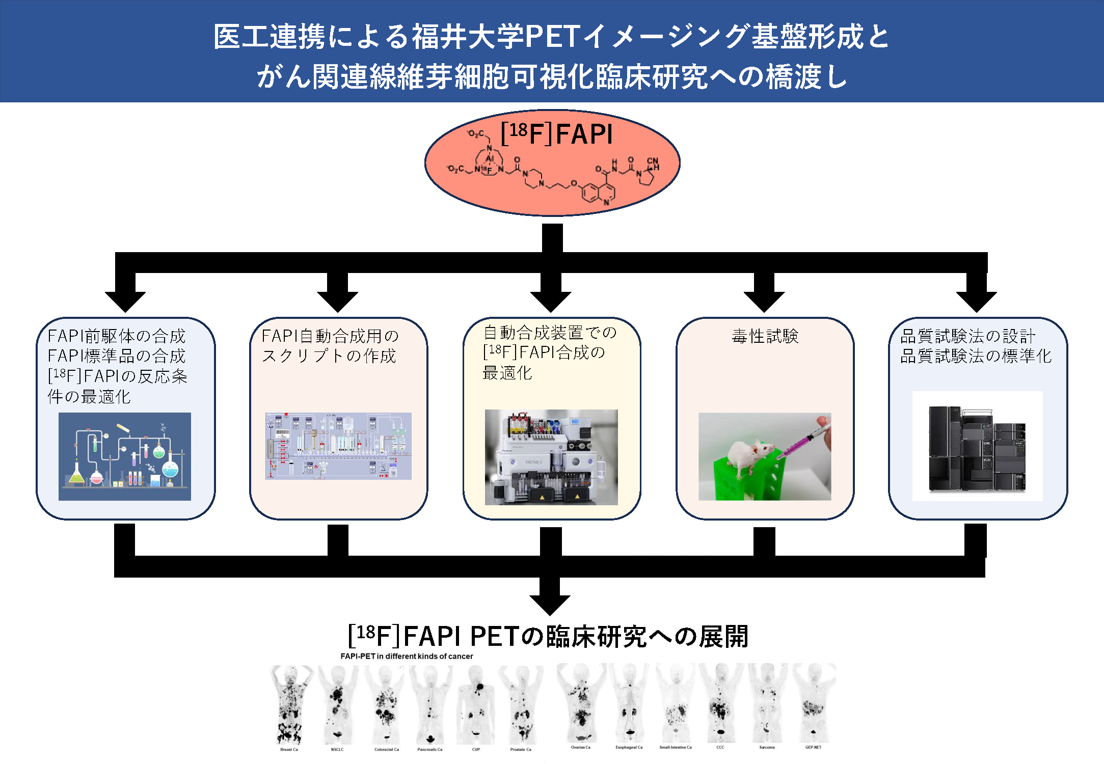 研究課題名にあてはまる項目 | プロセス・工法・要素技術などの開発 , 測定・評価方法(医療・バイオ含む) , 製品開発(繊維、工業製品、医薬品、医療機器など) | 研究概要 | がん関連線維芽細胞(CAF)は腫瘍増殖や免疫抑制、転移、治療抵抗性に関与する主要因子である。[18F]FAPI-PETはCAFを可視化し、病態把握や治療方針決定に有用とされる。福井大学では複数診療科からFAPI臨床研究の要望が強く、早期導入が求められている。本研究は医工連携研究のモデルケースとして、前駆体合成、反応条件最適化、自動合成スクリプト作成、品質試験法標準化を行い、毒性試験も実施する。2027年度に最終バリデーションとマニュアルを整備し、2028年度以降の臨床研究開始を可能とし、分子イメージング研究と地域がん医療の高度化に貢献する。 |