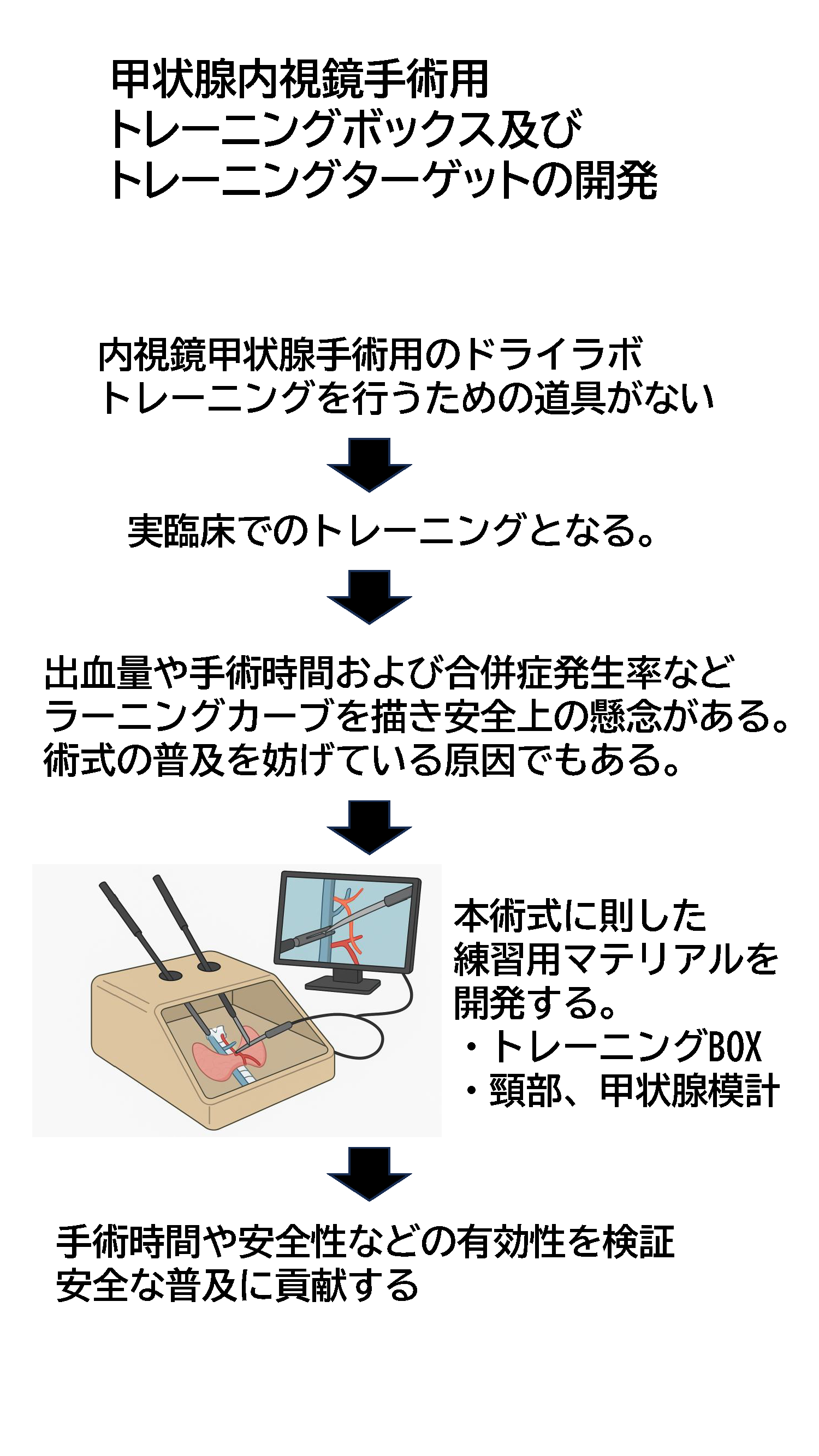 甲状腺内視鏡手術は整容性に優れた低侵襲術式であるが、習得には高度な技術を要し、専用トレーニング環境が存在しないことが普及の大きな障害となっている。腹腔鏡や胸腔鏡では教育用モデルが普及している一方、甲状腺領域では術者が実臨床に依存せざるを得ないのが現状である。本研究では、頸部特性に即したトレーニングボックスと甲状腺・反回神経・副甲状腺・血管を模した臓器モデルを開発し、剥離・結紮・止血などの基本手技を安全に反復可能とする。さらに操作時間や成功率で有効性を検証し、教育教材として整備することで、症例依存を減らし、安全な普及と技術標準化を推進する。
