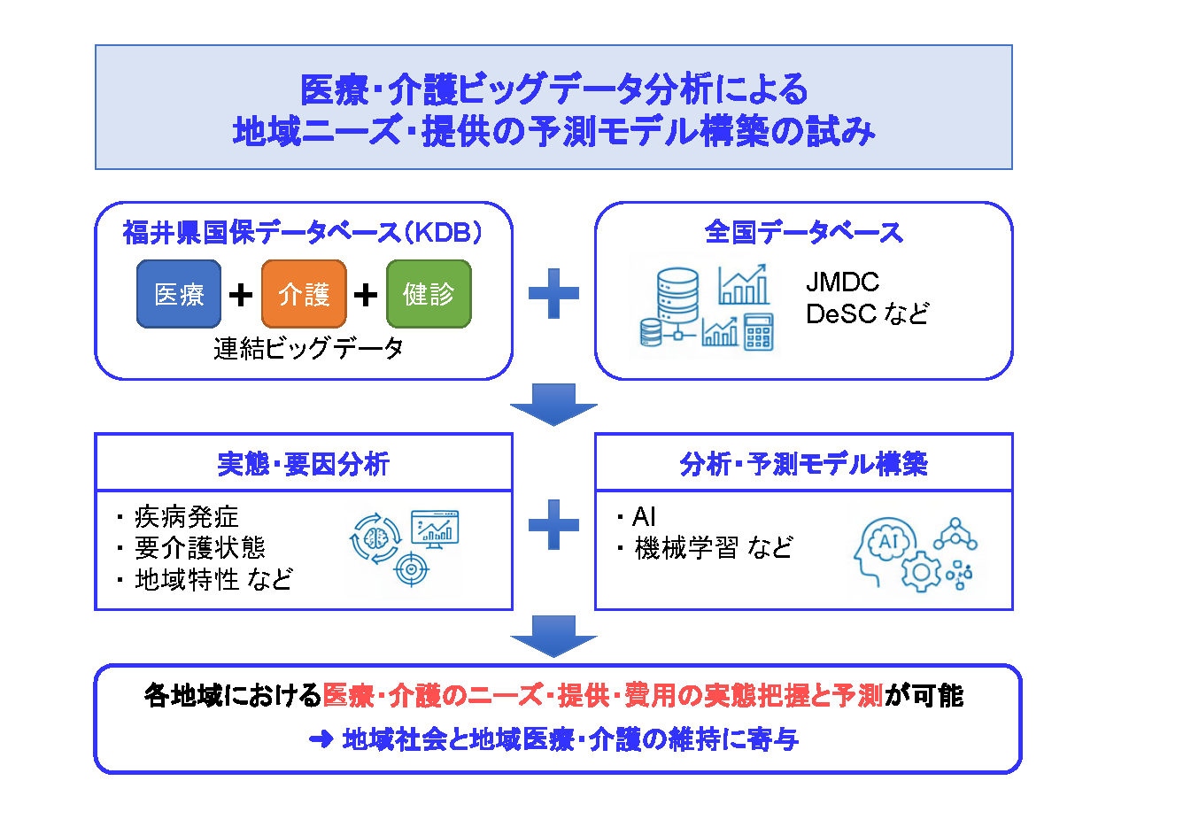 超高齢社会の進展と労働力の不足により、医療・介護のニーズ増加と提供量減少のミスマッチ悪化が懸念されているが、まだ実態も十分に把握されていない。我々は医療・介護ビッグデータである福井県の国保データベース(KDB)を用いた疾病や要介護の要因分析研究に取り組んでおり、各地域における医療・介護の実態を明らかにしつつある。本研究では実態・要因分析をさらに推し進め、全国データベースも利用し、AIや機械学習を用いて各地域におけるニーズ・提供・費用の正確な分析と予測モデルの構築を目指している。本研究によって医療・介護の実態把握および精密な予測が可能になれば、地域社会と地域医療・介護の維持に大きく寄与できる。